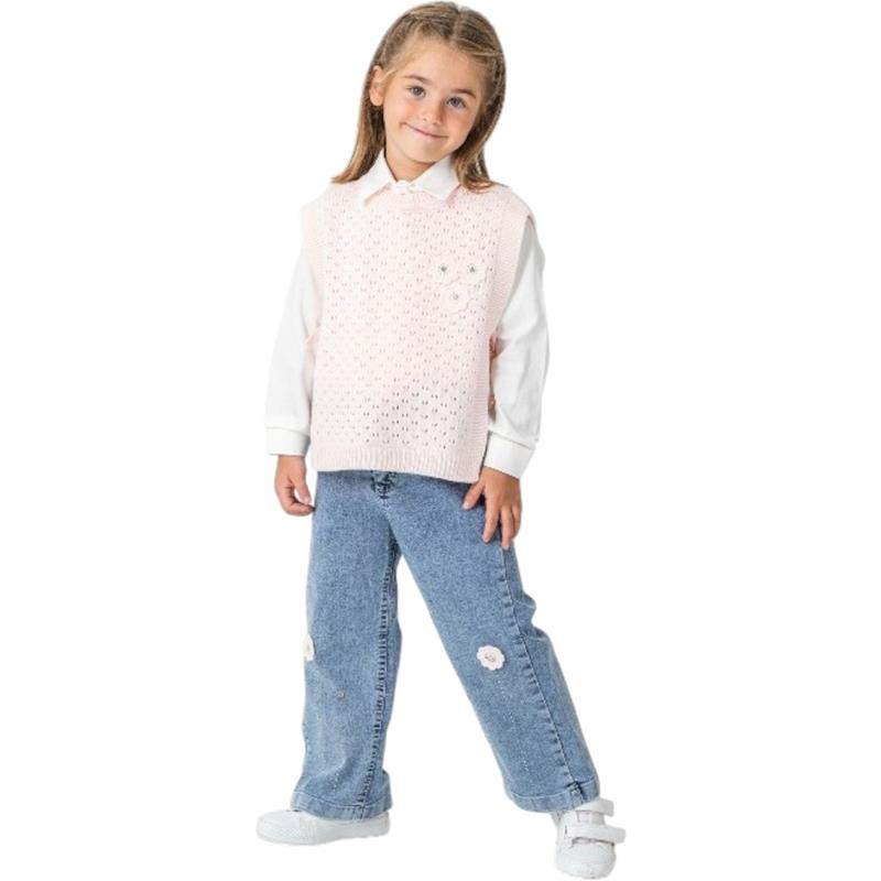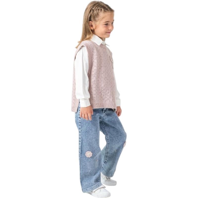 4503 Wholesale children's demi-season three-piece suits with shirts, knitted capes and denim trousers for girls aged 10/13 years