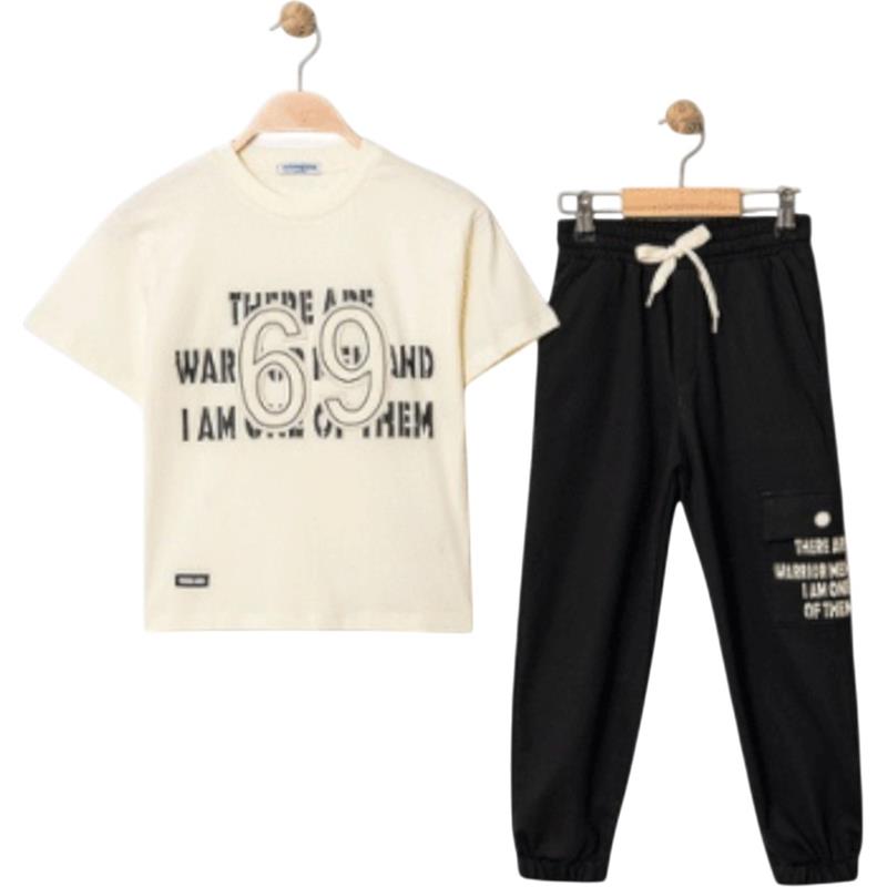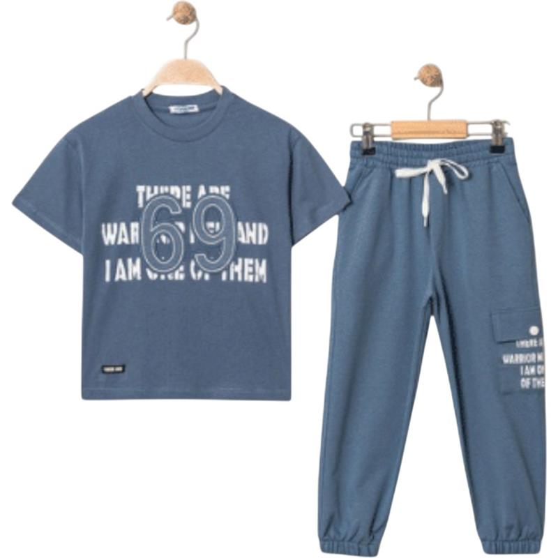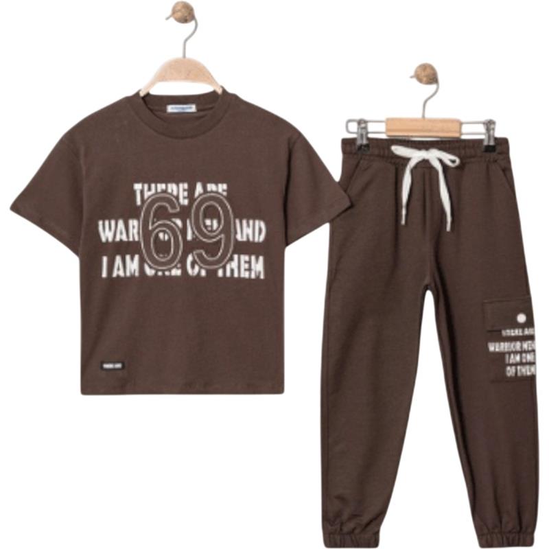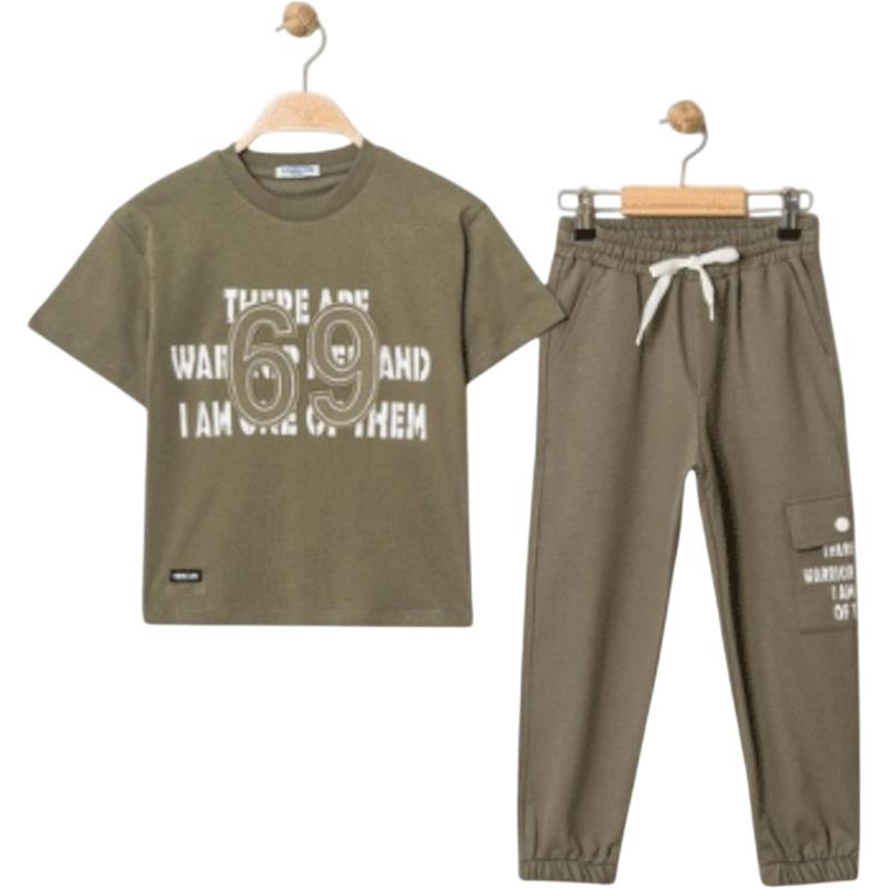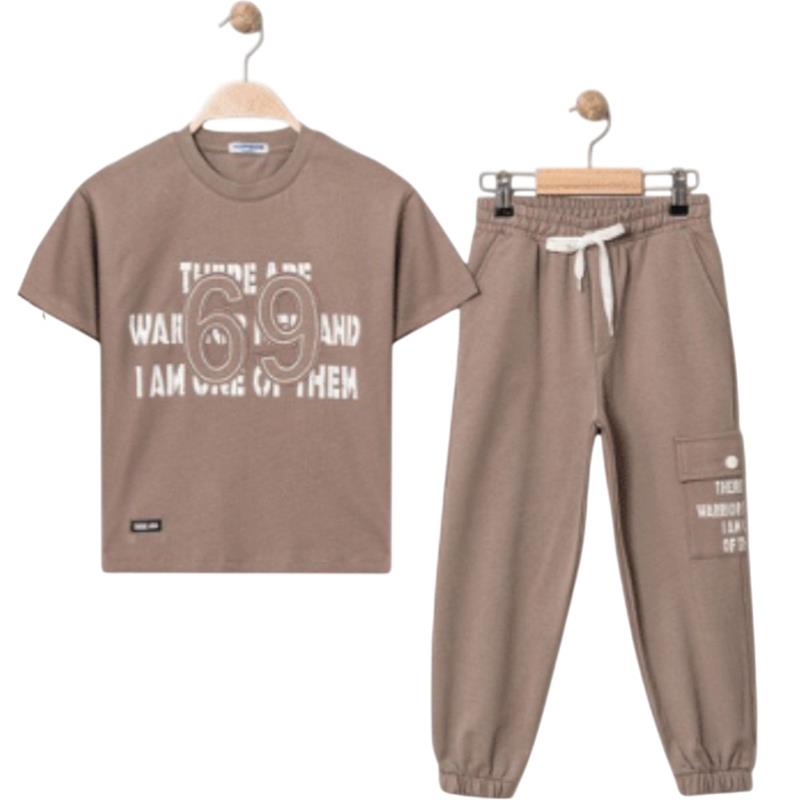 4315 Wholesale of a two-piece summer suit for boys aged 9-12, consisting of a T-shirt with a 69 print and trousers