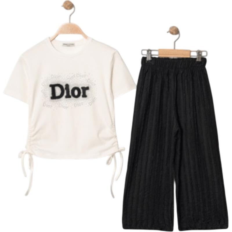 7338 wholesale children's summer two-piece suits, T-shirts with DİOR embroidery and trousers for girls aged 5/8 years