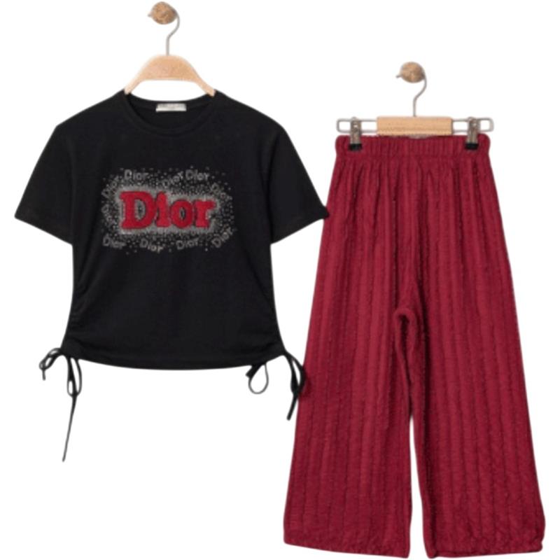 8338 wholesale children's summer two-piece suits, T-shirts with DİOR embroidery and trousers for girls aged 9/12 years