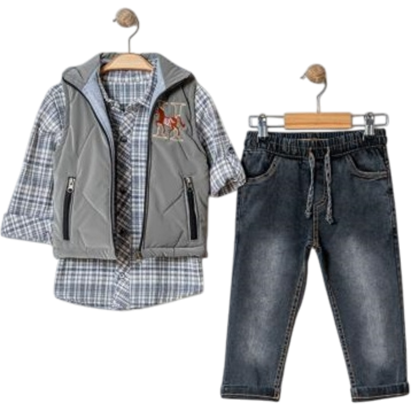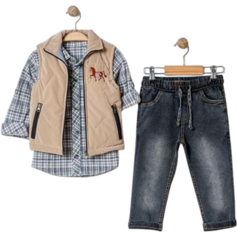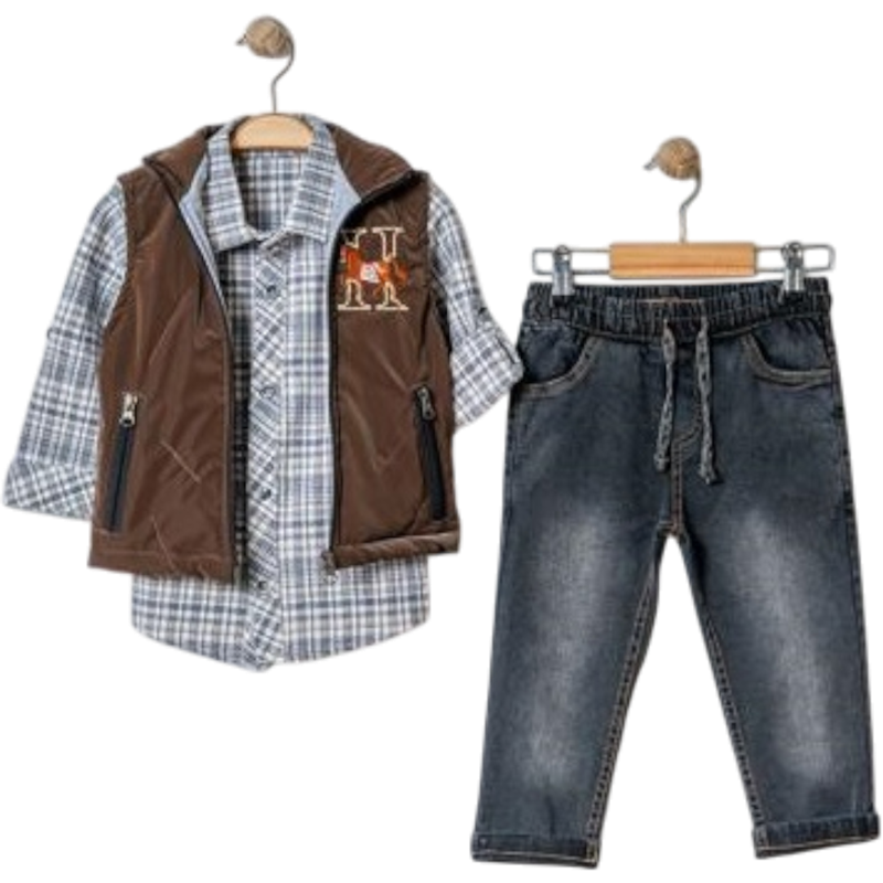 7206 toptan 9/24 aylık erkek çocuklar için gömlekli,yelekli ve kot pantolonlu mevsimlik üçlü takım