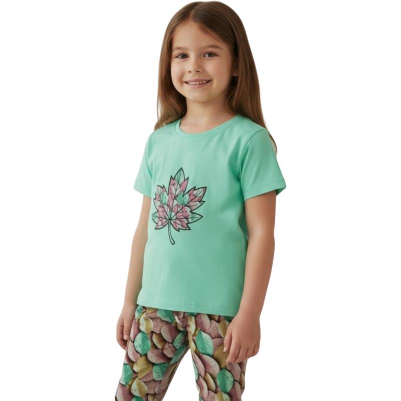 80820 toptan 11-15 yaş arası kız çocukları için tişört ve pantolondan oluşan iki parçalı yazlık takım
