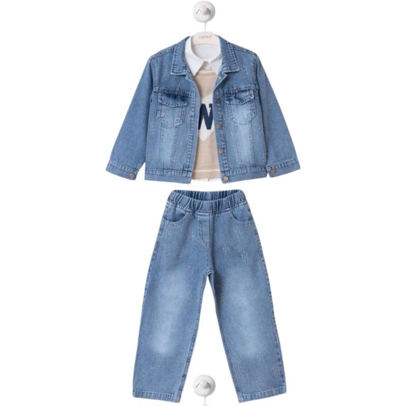 26327 toptan 5/8 yaş arası kız çocuklar için gömlekli,triko kazaklı mevsimlik dört parçalı kot takım elbise