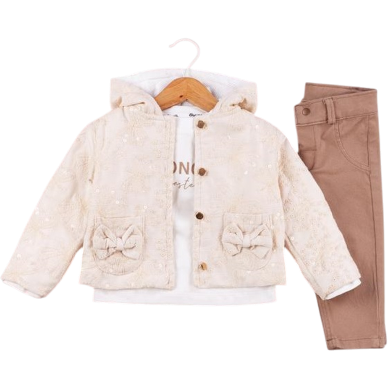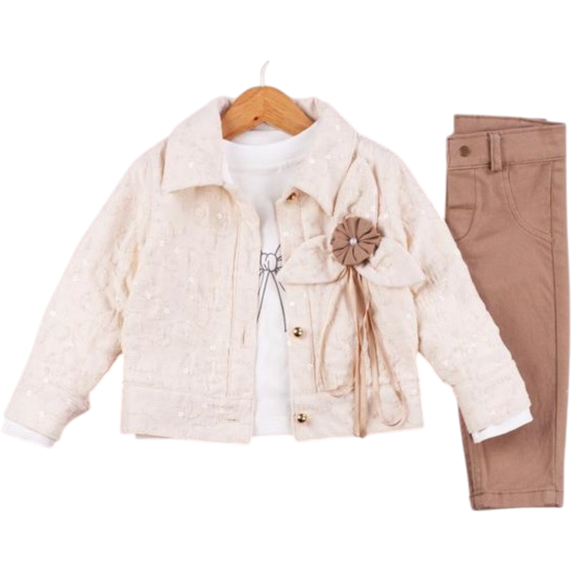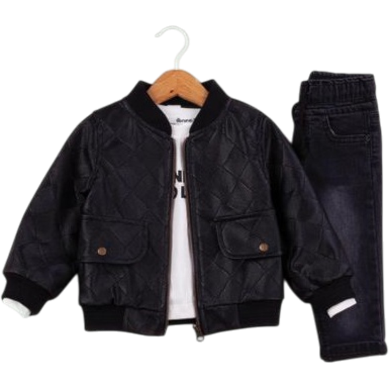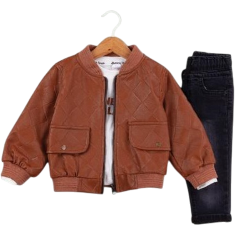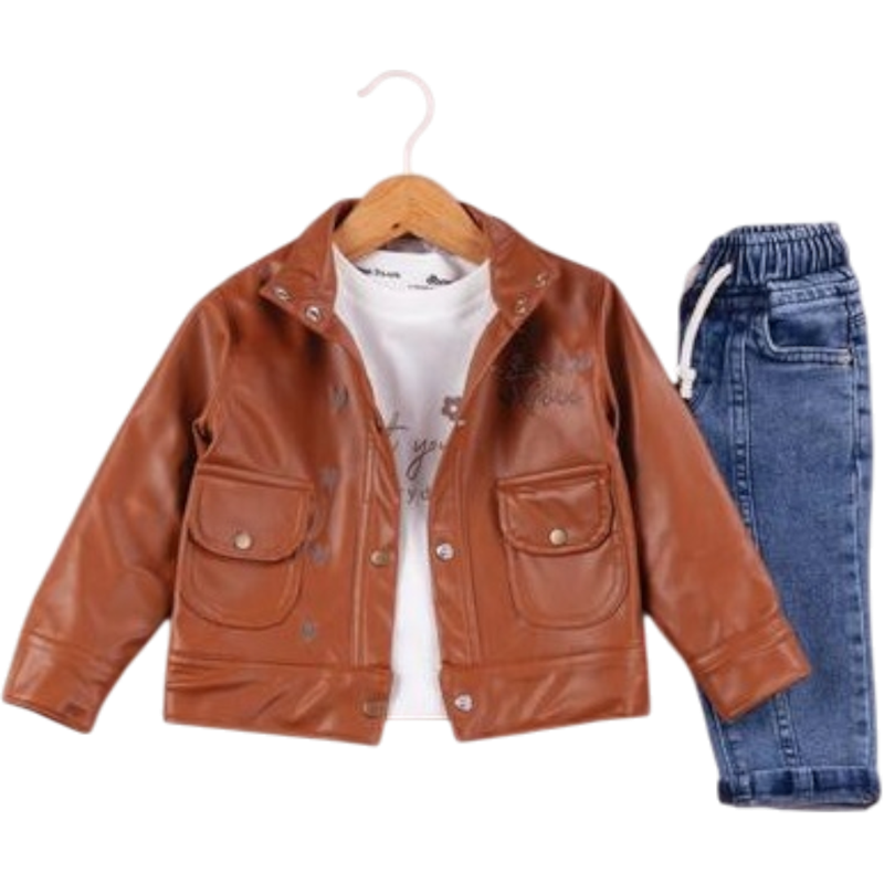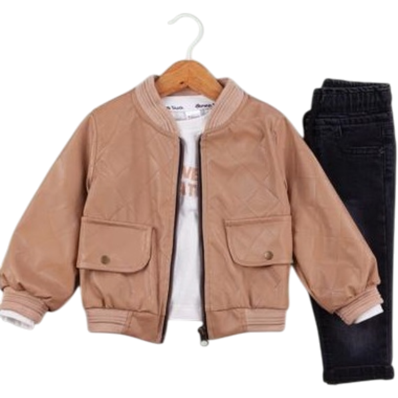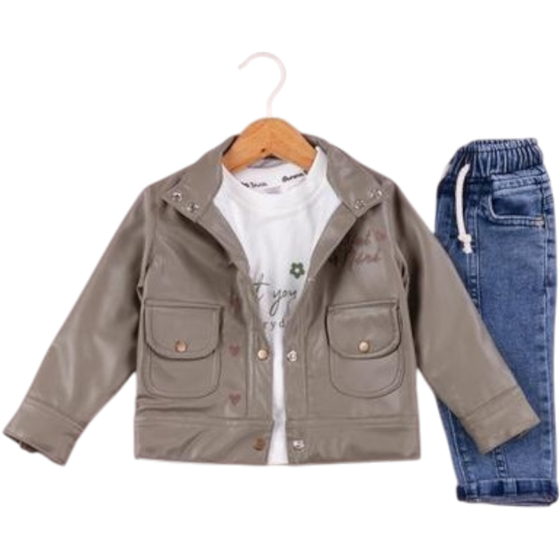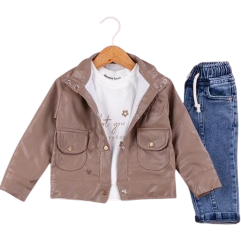 50650 toptan 6/24 aylık kız bebekler için suni deri montlu,tişörtlü, kot pantolonlu üçlü takım elbise