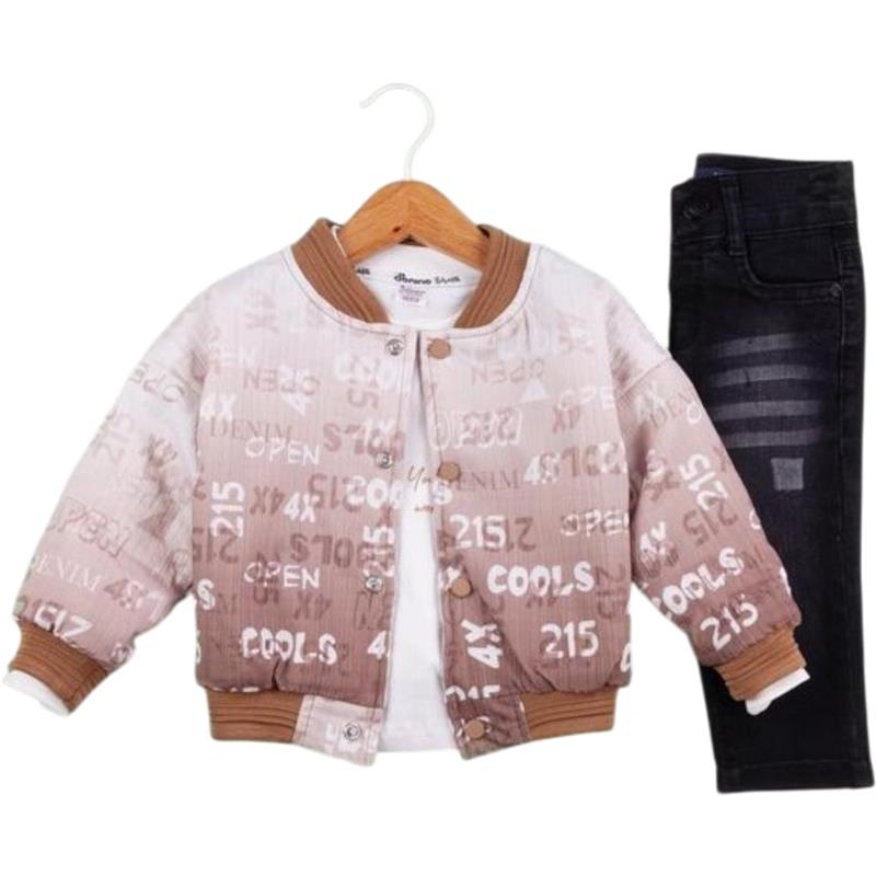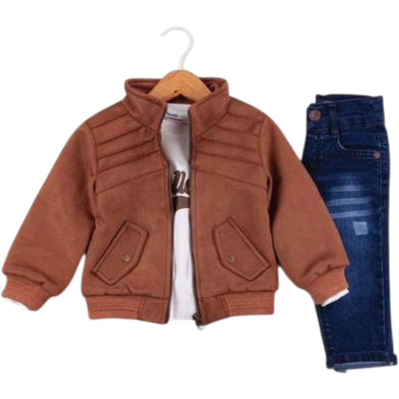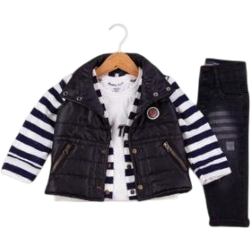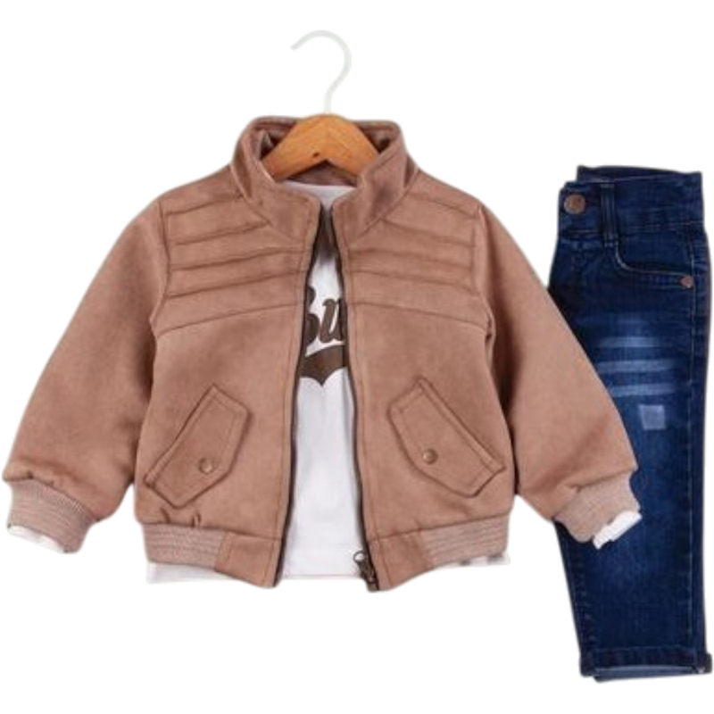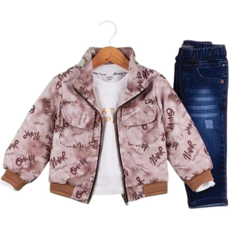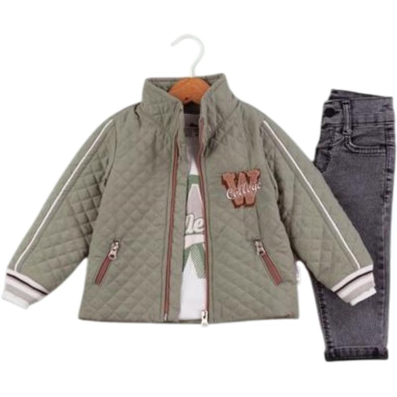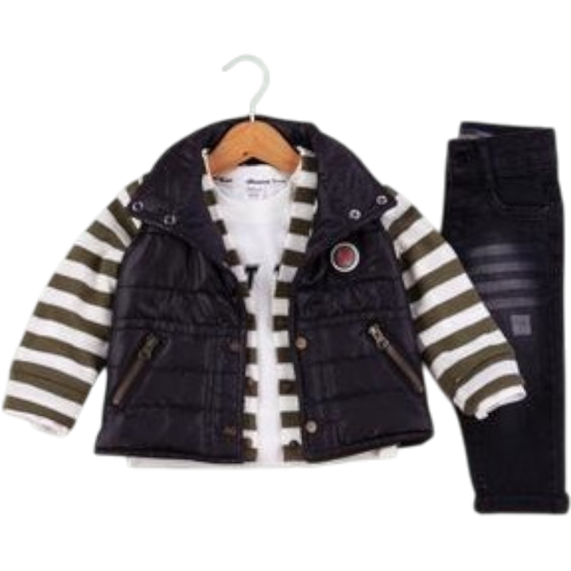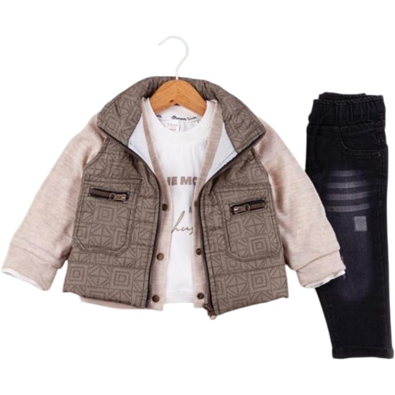 50627 toptan 6/24 aylık erkek bebekler için montlu,tişörtlü, kot pantolonlu üçlü takım elbise