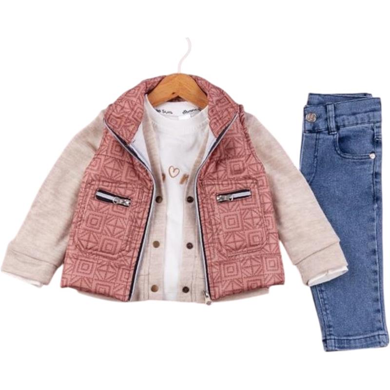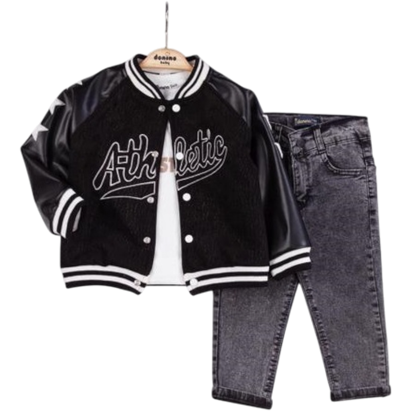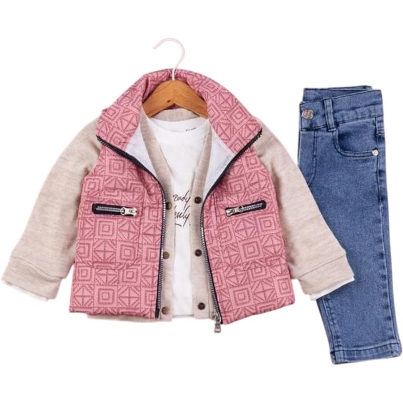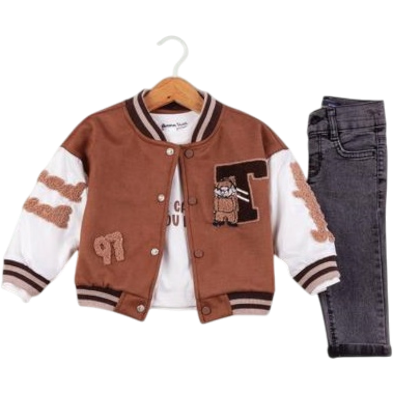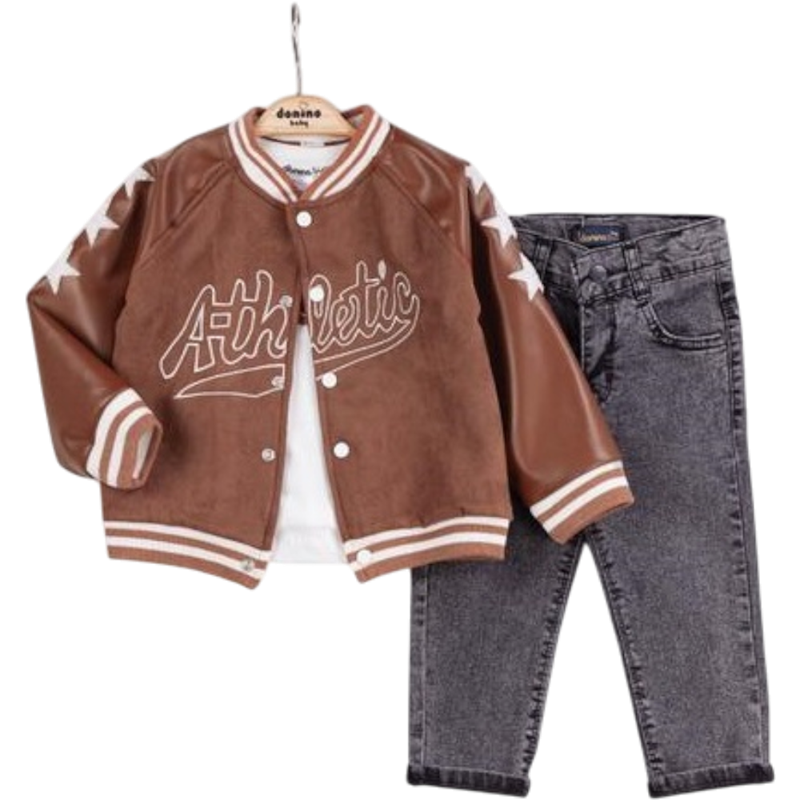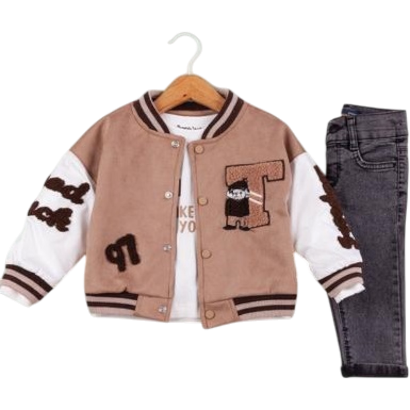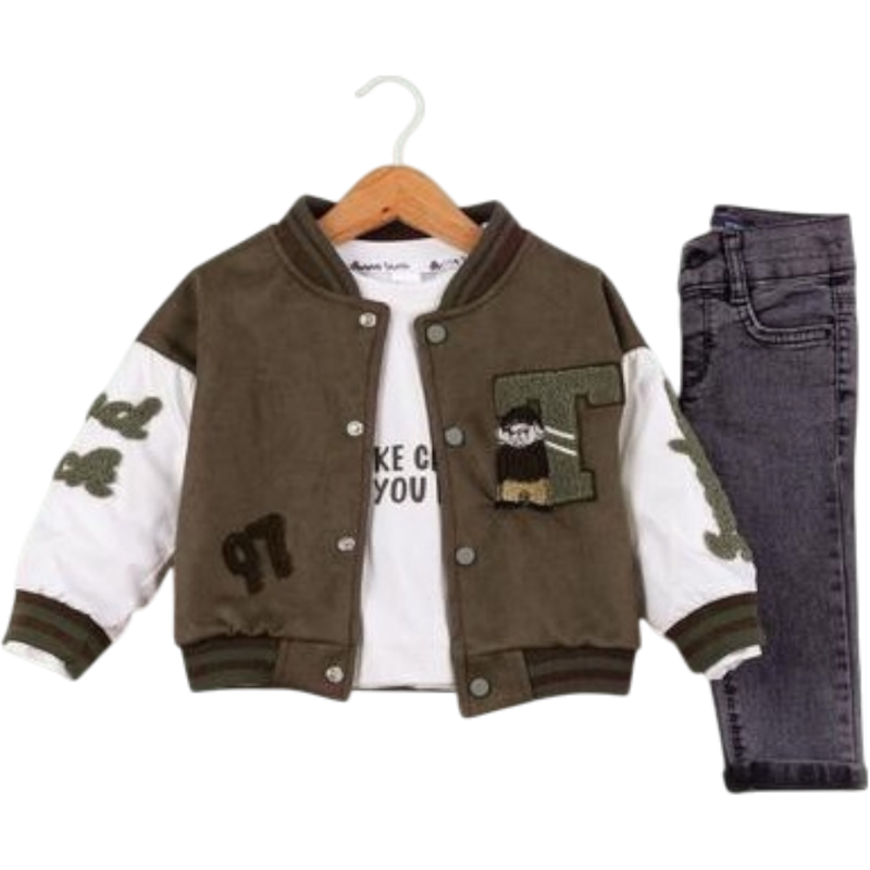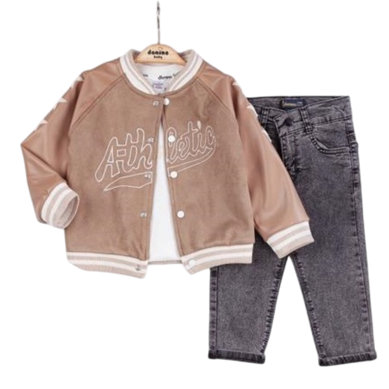 50627 toptan 6/24 aylık erkek bebekler için montlu,tişörtlü, kot pantolonlu üçlü takım elbise
