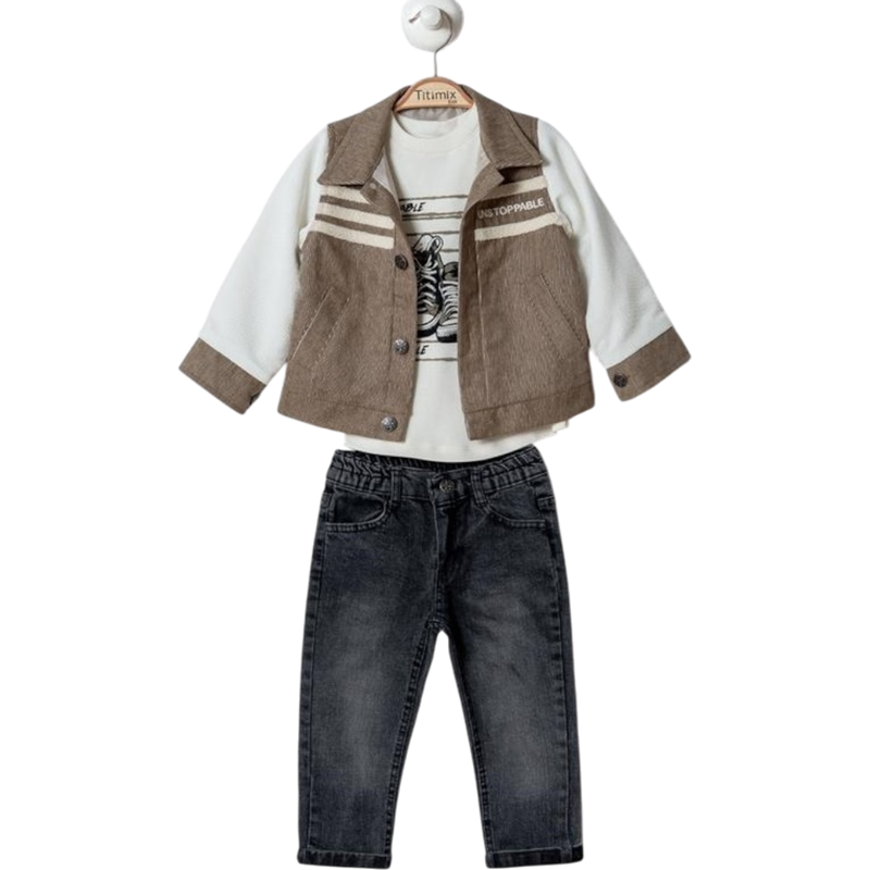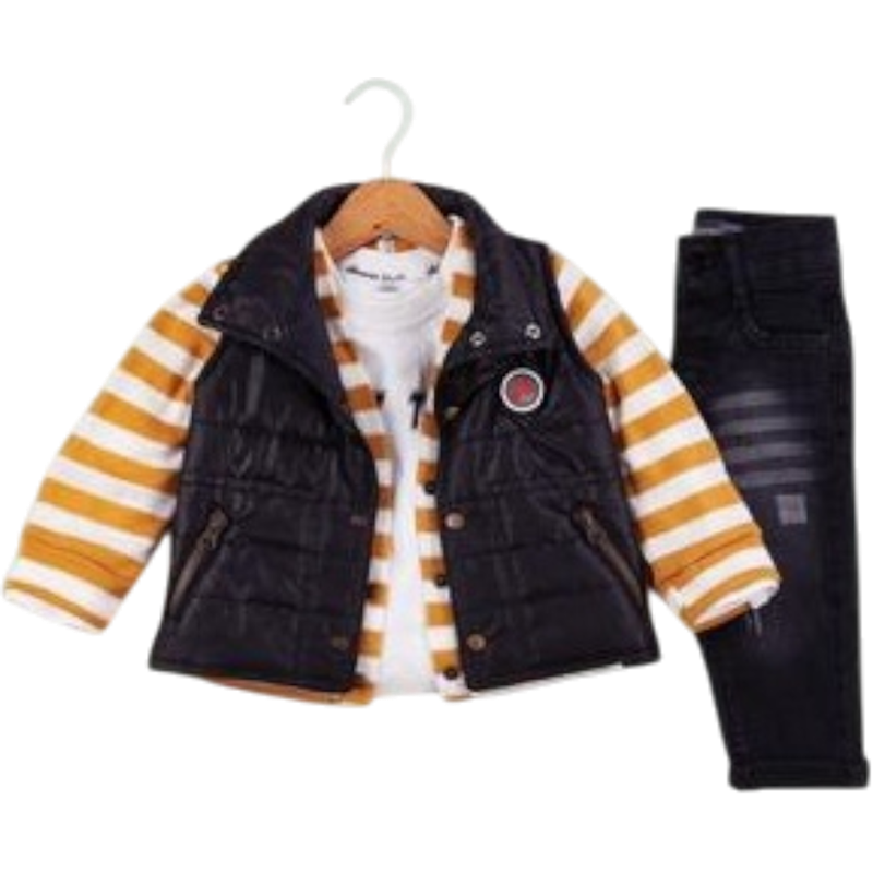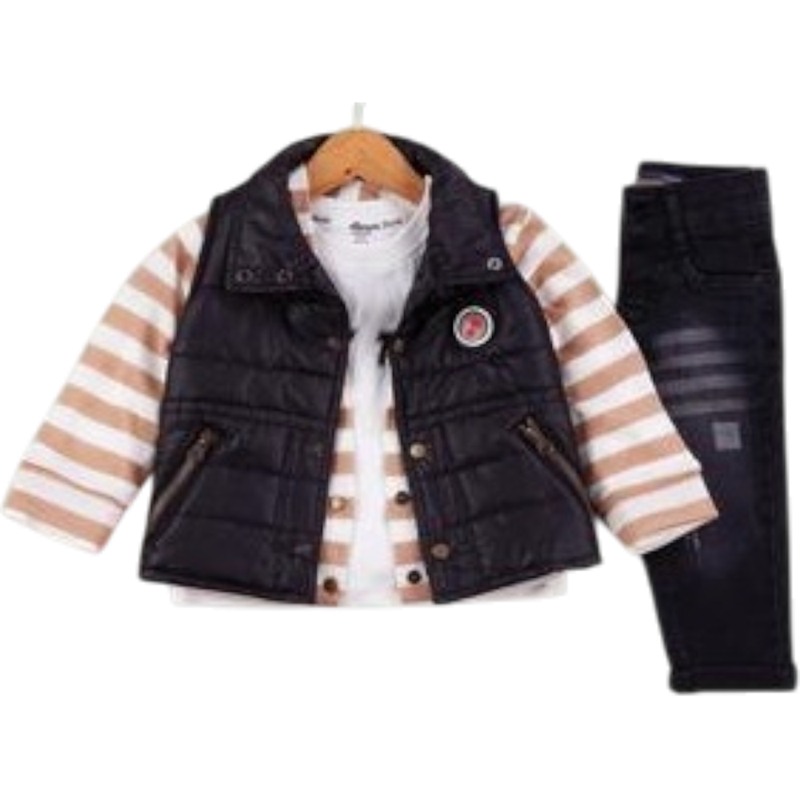 50664 toptan 6/24 aylık erkek çocuklar için üç parçalı kot pantolonlu,yelekli mevsimlik takım elbise