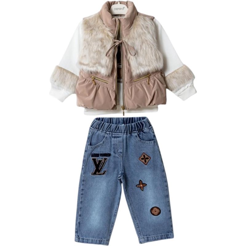 1202 toptan 1/4 yaş kız çocuklar için svitşortlu üç parçalı mevsimlik kot takım elbise