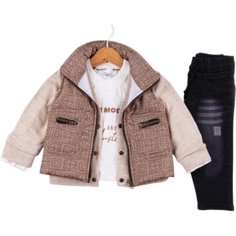 50640 toptan 6/24 aylık erkek bebekler için montlu,tişörtlü, kot pantolonlu üçlü takım elbise